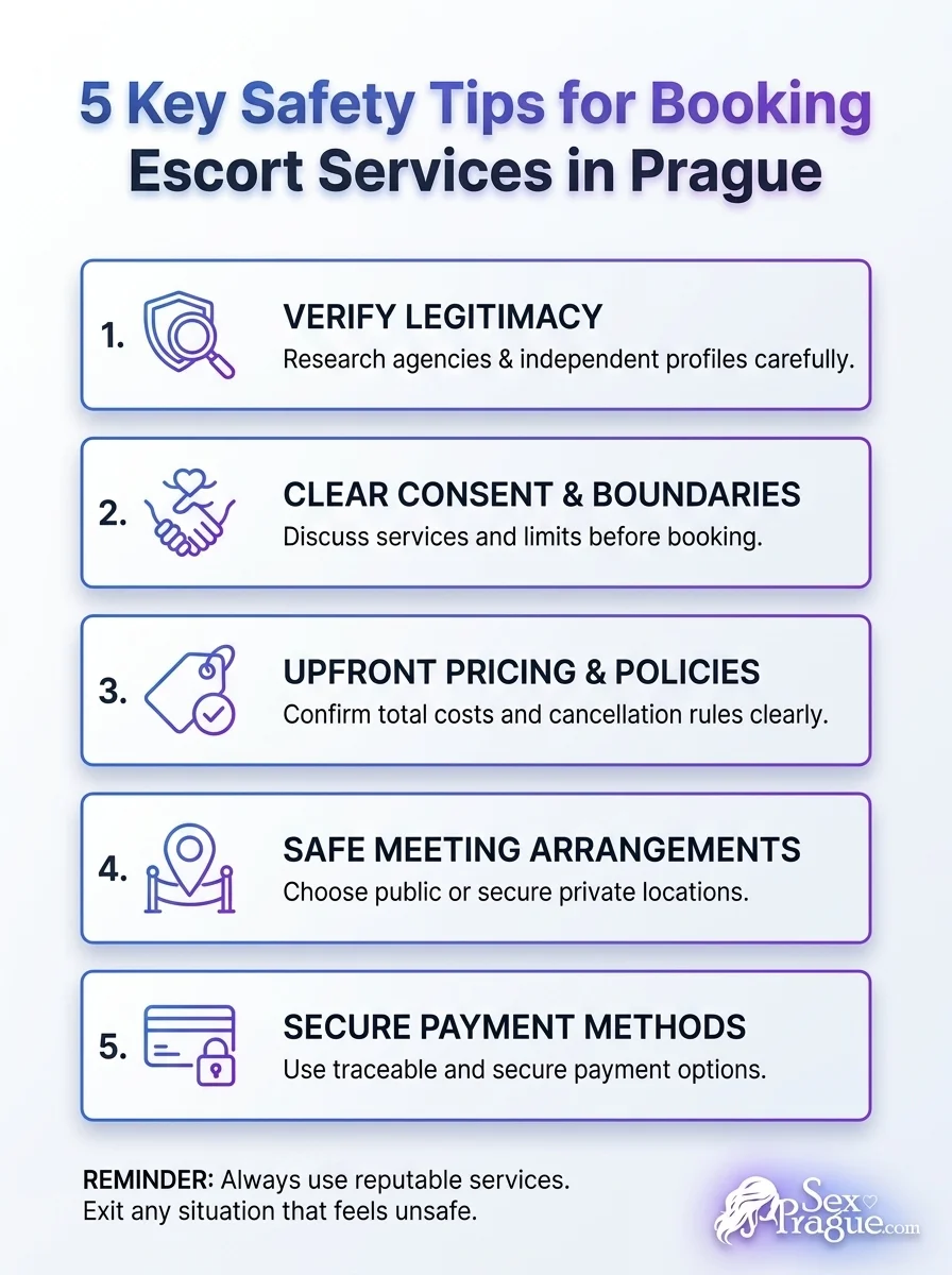 This infographic highlights five essential safety tips for booking escort services in Prague. Follow these steps to stay secure and informed.
